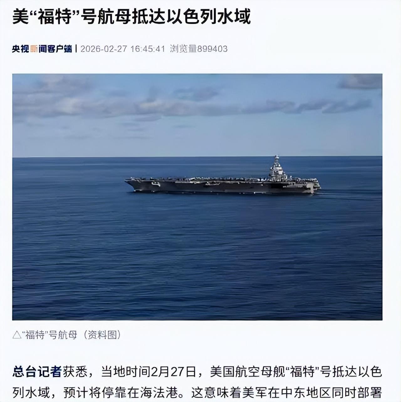 美國海軍的福特號航母在2月27日靠近以色列海域,準備停靠港口。這艘航母是美軍最新的,帶着不少隱形戰機和導彈,火力很強。加上之前就位的那艘林肯號,現在中東有兩艘航母編隊,這種規模自從上世紀初的伊拉克戰爭後就沒見過。