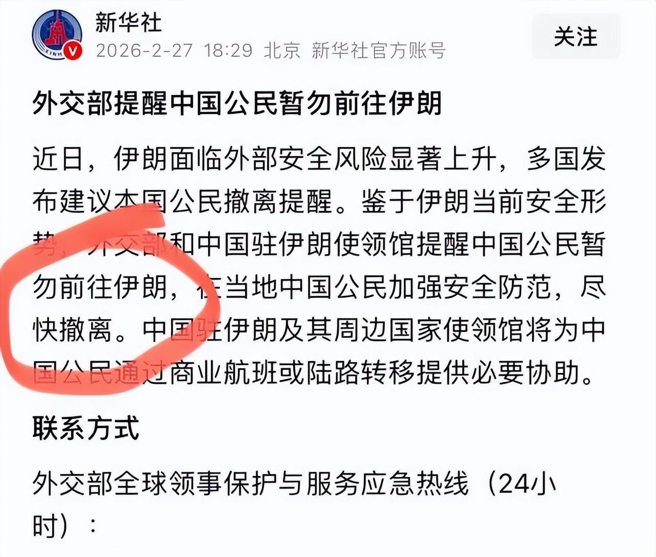 2026年2月27日,中國外交部發布安全提醒,指出伊朗安全風險上升,要求公民暫勿前往,並在當地人員儘快離境。