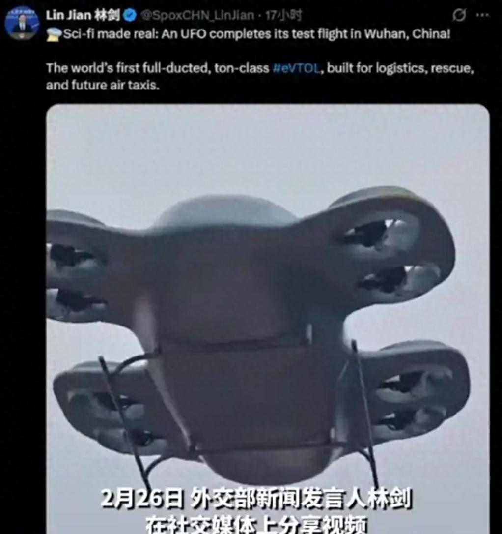 2月26日,外交部發言人林劍在社交平臺上發佈了“飛碟”在武漢試飛的視頻,這款叫做“電鷹飛車EFC1200”的全球首架全涵道式噸級電動垂直起降飛行器亮相,可以說是填補了全球在這一領域的技術空缺,也爲中國在保持空中優勢地位上奠定了更加堅實的基礎。