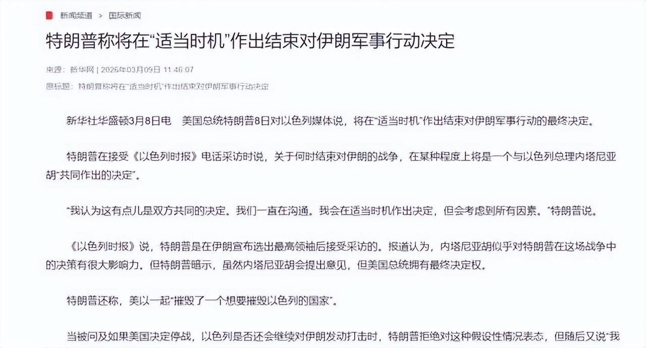 多家權威媒體對這一系列事件進行了跟蹤報道,新華社和美國阿克西奧斯新聞網站都確認了美方不滿的具體內容。以色列軍方在3月7日打擊後發佈的聲明,被美方視爲超出預期的證據。特朗普在採訪中沒有迴避問題,而是直接回應了結束行動的可能性,這在外界看來是明確的態度轉變。伊朗方面的回應則通過領袖更迭體現出來,繼續維持強硬路線。
