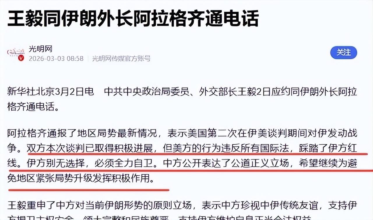 中國外交部否認交易,稱報道不實,堅持敦促停火。伊朗外長阿拉格奇多次致電王毅,通報美以違反國際法,伊朗被迫自衛。王毅回應,北京支持伊朗主權,願推動和平,但未承諾武器援助。