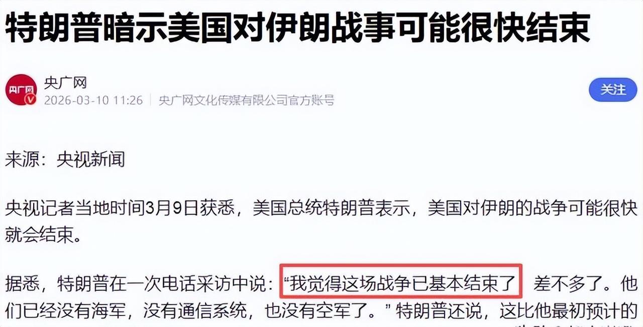 特朗普那邊動作也不慢,三月九日下午他接了美國哥倫比亞廣播公司記者的電話,直接說對伊朗的戰事已經進行得很徹底,覺得戰爭基本結束了。他還列了伊朗海軍通訊設施空軍導彈無人機這些基本沒了能力,從軍事上看對方所剩無幾。這話放出來後,國際上不少媒體都轉了,感覺美國在釋放要收手的信號。特朗普提到進展比他一開始想的快得多,還說霍爾木茲海峽船隻通行情況在恢復。