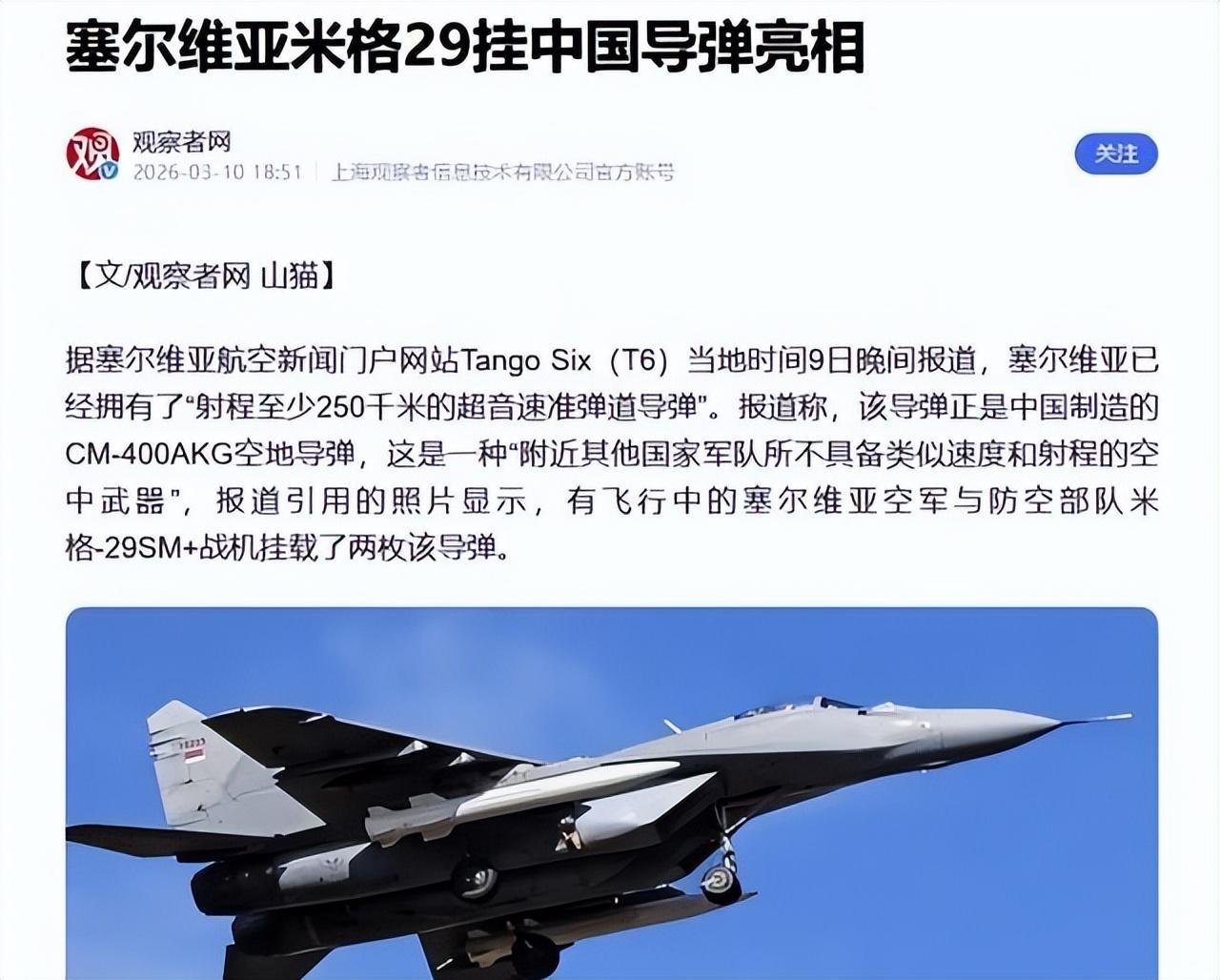 塞爾維亞的國防建設這些年一直沒停。空軍主力還是那些米格29,經過幾次升級後,現在又加了這個新系統。整個過程沒對外公佈細節,但從照片和總統確認來看,整合已經完成並形成作戰能力。塞爾維亞是巴爾幹地區唯一堅持軍事中立的國家,周邊全是北約成員,這讓它在裝備選擇上得走自己的路。買中國導彈這件事,等於在現有平臺上快速提升了打擊能力,避開了大改飛機的麻煩。武契奇在講話裏沒細說導彈性能,但反覆強調這是塞爾維亞空軍現在手裏實實在在的工具。