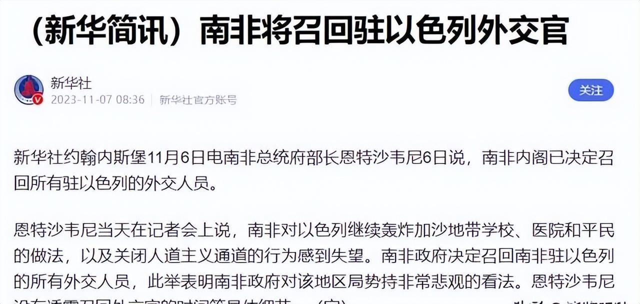 南非從2023年11月6日開始就對以色列在加沙的行動採取了實際步驟。那天政府宣佈召回所有駐以色列的外交人員,理由是擔心平民傷亡不斷上升,認爲以色列的回應方式已經超出正常範圍。外交人員隨後從特拉維夫撤回比勒陀利亞,政府表示這是爲了評估雙邊關係還能不能繼續維持下去。沒過兩週,11月21日,南非國民議會開會表決,通過了一項動議,要求暫停外交聯繫並且考慮關閉以色列駐南非的大使館。投票結果多數支持,雖然這不直接強制執行,但清楚顯示了南非的立場轉向。