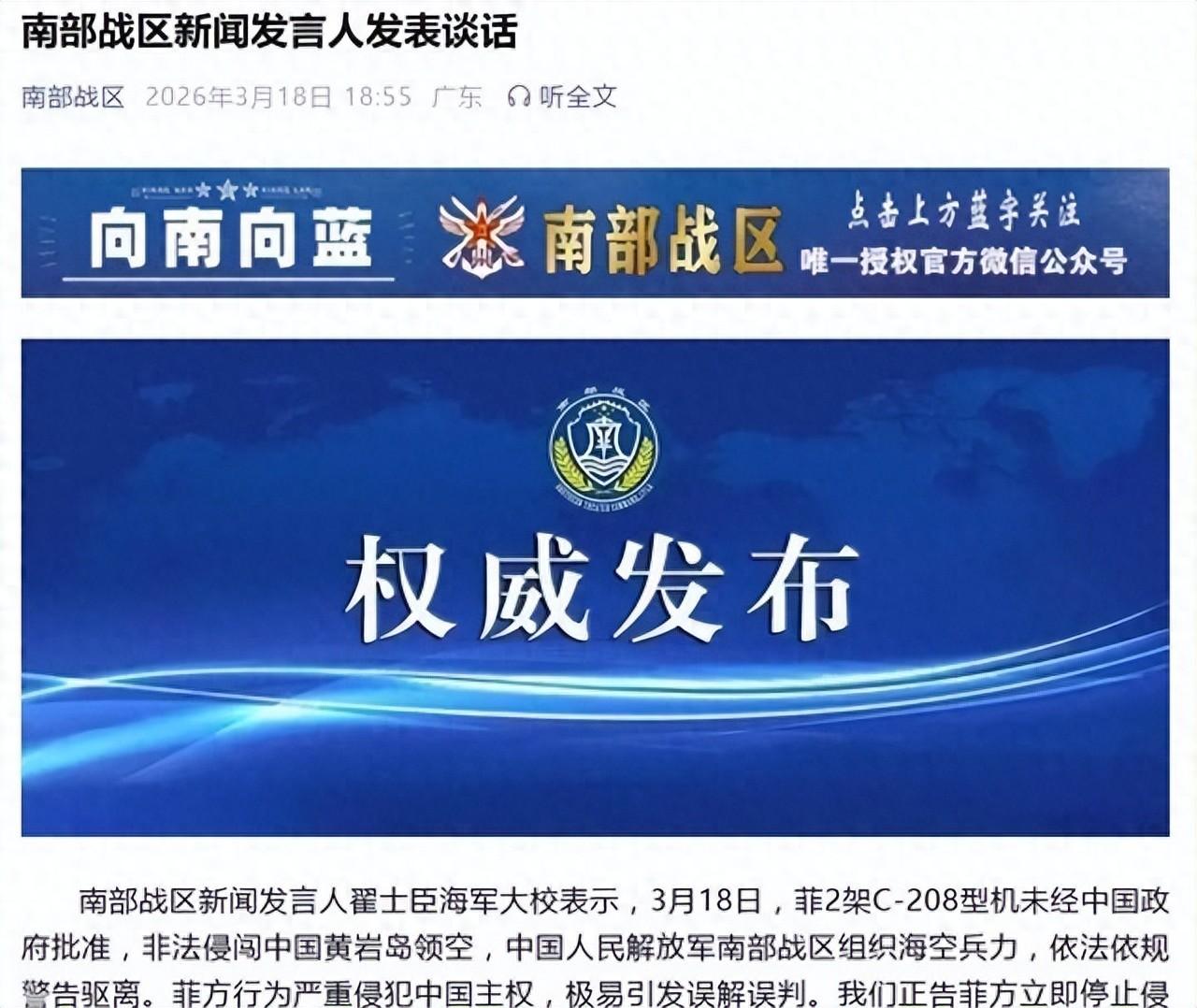 南海這段時間的動靜鬧得挺大,菲律賓那邊連續派飛機往中國島礁空域跑,日本首相高市早苗正好在美國開會的時候表了個態,說日本對中國問題會冷靜處理。這事兒前後連着看,時間點卡得挺緊,3月18日先是菲律賓的C-208型飛機進了黃巖島領空,中國南部戰區海空兵力馬上出動,依法跟蹤監視並且警告驅離。南部戰區發言人翟士臣海軍大校在通報裏把情況說清楚了,強調這種行爲侵犯主權,要求菲律賓馬上停手,別再搞挑釁。
