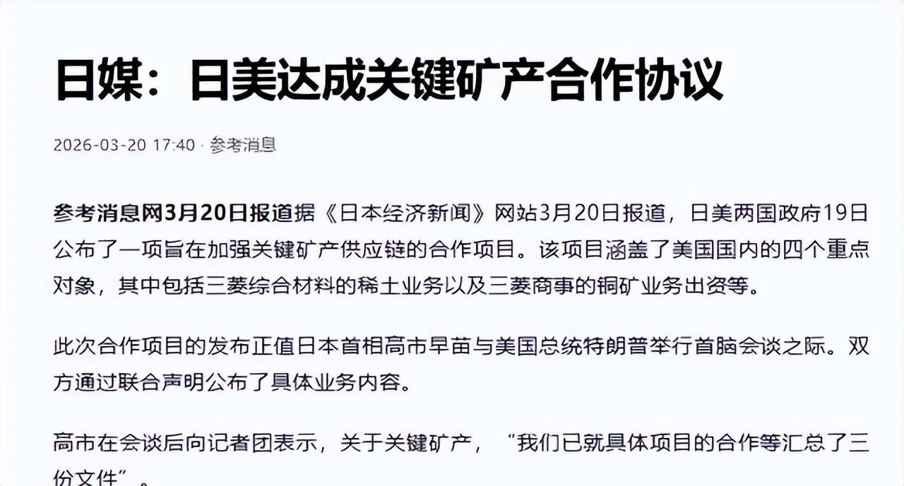 美日那邊的礦產計劃其實也不是頭一回提。之前兩國已經在類似領域有過一些框架,這次直接升級成行動計劃,重點放在擴大可靠來源和減少外部依賴上。聲明裏提到要通過多國框架來推進,還包括一些聯合研究和項目落地安排。整個過程就是兩國領導人坐在一塊兒,把安全議題和經濟安全議題捆在一起談,成果文件裏安全部分和資源部分都佔了位置。