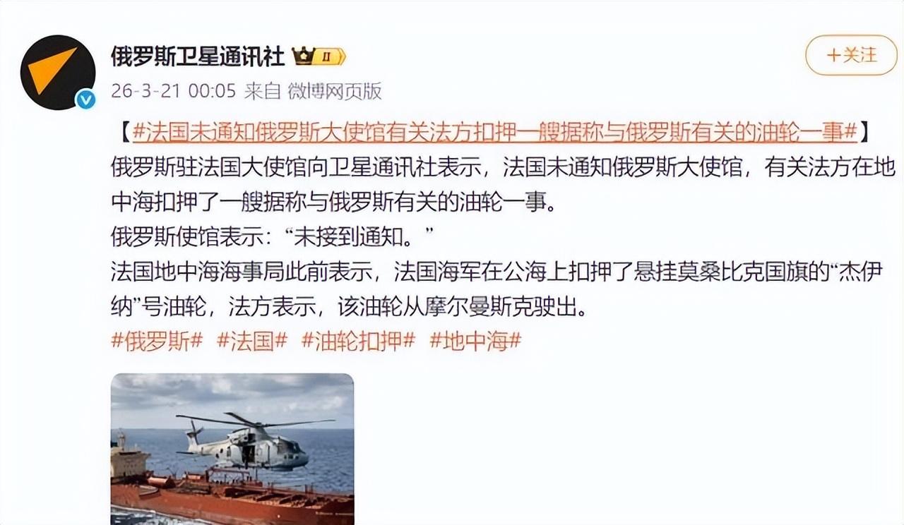 俄羅斯駐法國大使館在3月21日作出回應,表示法國方面事先沒有通知使館,目前也沒有收到關於船上人員情況的具體信息。使館把這個情況通報給了國內相關部門。油輪在攔截後繼續接受監控,航行路線調整後逐步向馬賽方向移動。3月23日油輪抵達馬賽港口附近,移交給當地司法部門進行調查處理。這次行動不是孤立的,法國在之前幾個月裏已經對類似油輪採取過幾次攔截措施,比如1月份扣押過一艘,9月份也處理過另一艘,都涉及影子艦隊相關問題。西方國家整體上加強了對這類船隻的打擊,目的是切斷規避制裁的能源流動渠道。