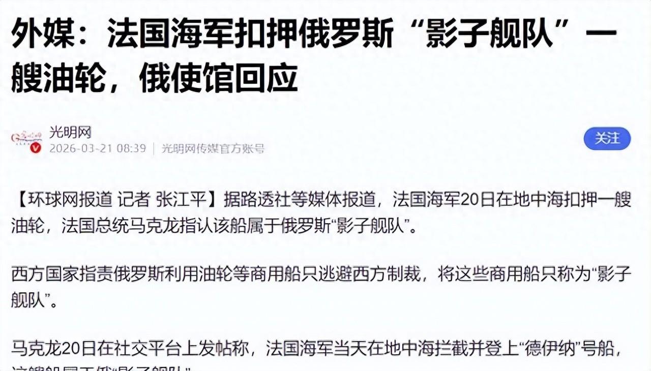 2026年3月20日法國海軍在地中海西部海域對一艘油輪採取了攔截行動。這艘油輪叫德伊納號,懸掛莫桑比克國旗,從俄羅斯西北部的摩爾曼斯克港出發。法國方面認定它屬於規避國際制裁的影子艦隊一員,專門用來運輸俄羅斯石油。海軍人員登船檢查了國旗和相關文件,發現國旗有效性存在疑問,行動結束後油輪被要求改變航向,由海軍護送前往指定錨地接受進一步覈查。法國總統馬克龍當天在社交平臺發佈消息,確認了這次攔截和登船檢查,指出這類船隻試圖通過違規方式爲相關活動提供資金支持。整個過程是法國與盟友合作完成的,目的是維護制裁執行力度。