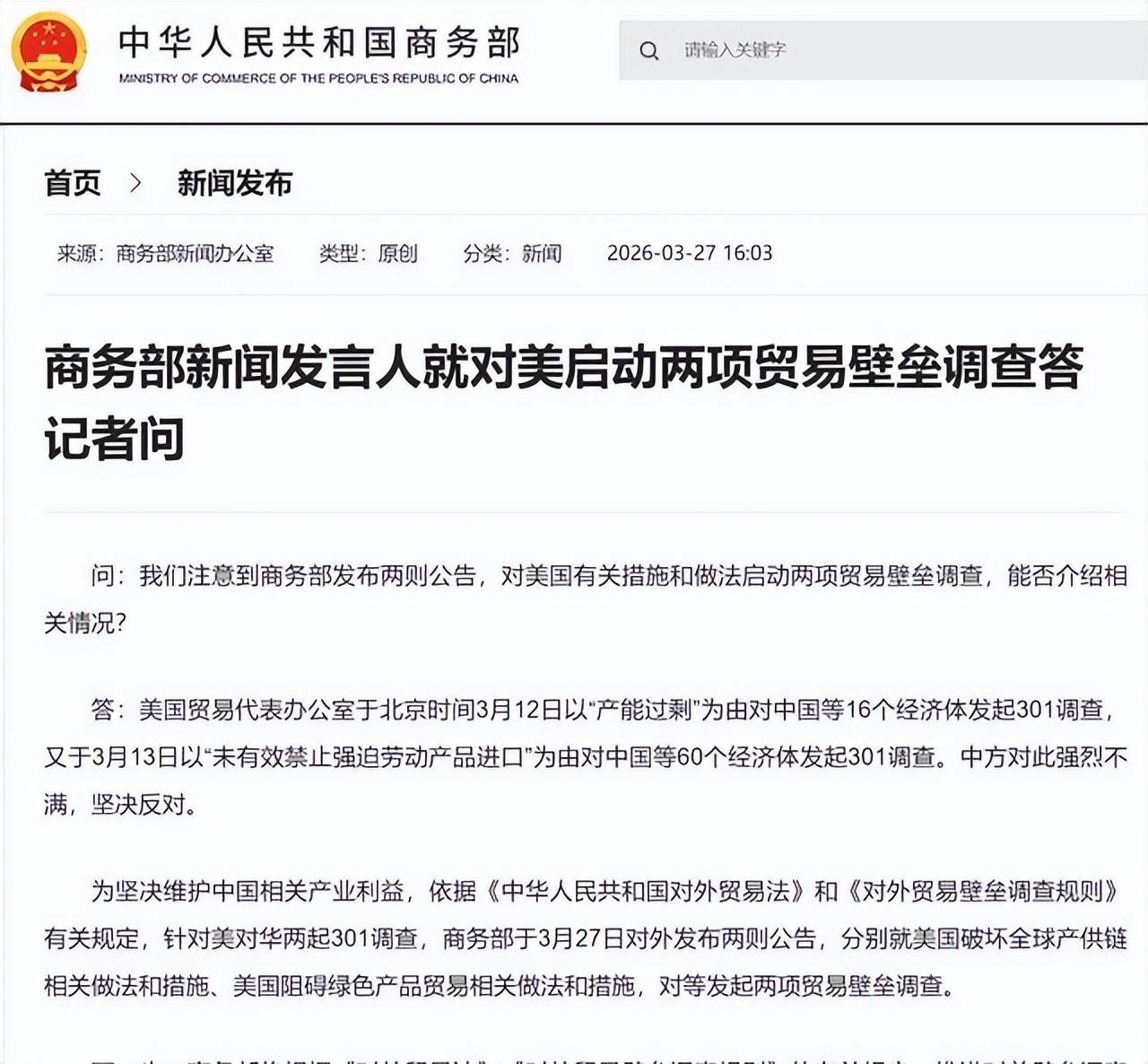 3月27日,商務部直接發佈兩則公告,根據對外貿易法和貿易壁壘調查規則,對美國破壞全球產供鏈的相關做法和措施,以及阻礙綠色產品貿易的相關做法和措施,啓動了兩項貿易壁壘調查。這兩項調查完全是對等回應美方先前發起的那兩起301調查。美方在3月12日以產能過剩爲由對包括中國在內的16個經濟體啓動301調查,3月13日又以未有效禁止強迫勞動產品進口爲由,對包括中國在內的60個經濟體啓動另一輪301調查。中方對這些單邊舉措一直強烈不滿,這次通過貿易壁壘調查的方式,把維護自身產業利益的立場落到了實處。