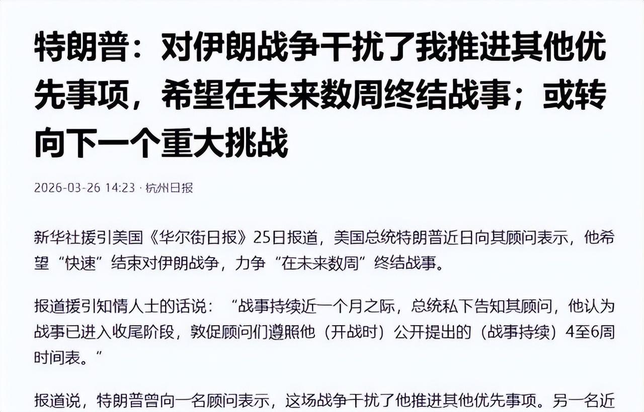 中東那邊打了一個月左右,美國和以色列針對伊朗的行動還在繼續,雙方都有損失,美國國內因爲能源價格上漲,普通人生活開銷跟着增加。特朗普在公開場合還是那套強硬說法,要求伊朗趕緊回應,不然就得承擔後果。可美國媒體在3月25日和26日這幾天報道出來,特朗普私下跟身邊顧問聊的時候,已經在表達對這場衝突拖太久的不滿,他覺得這事兒佔用了太多精力,影響其他重要事情的推進,希望能按之前定下的時間安排儘快收尾,別拖成長期拉鋸。
