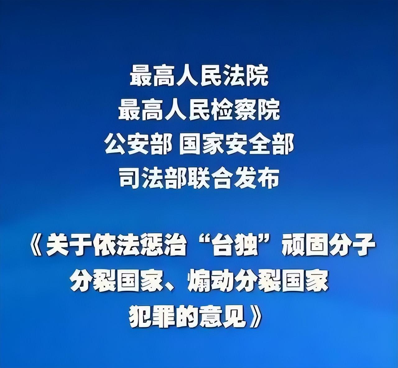 原因其實不復雜。大陸"兩高三部"聯合發佈了《關於依法懲治"臺獨"頑固分子分裂國家、煽動分裂國家犯罪的意見》,這份文件一亮出來,島內反應快得出奇。