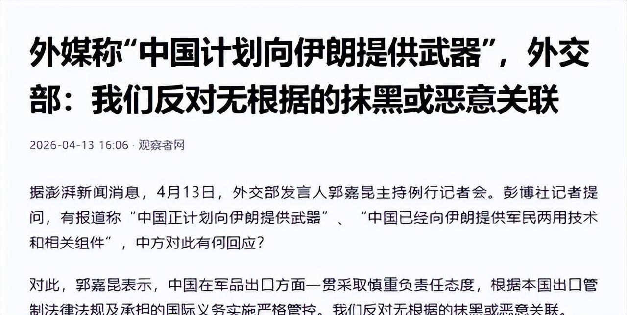 據觀察者網報道,4月13日,針對外媒散佈的所謂"中國計劃向伊朗提供武器"的說法,中國外交部發言人明確作出回應:中方的軍品出口嚴格遵守國際法與國內法規,有關中方軍援伊朗的報道純屬捏造,中方反對無根據的抹黑或惡意關聯。 表態乾脆利落,直接戳穿了美方的謊言。