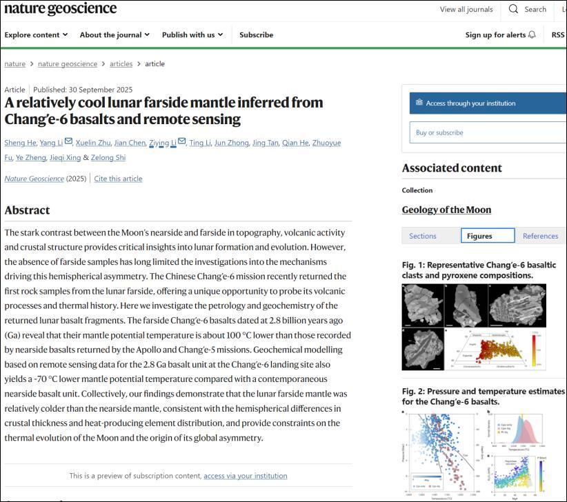 我國科學家利用多種手段對嫦娥六號從月球背面帶回的玄武岩樣品進行了精細分析。這些樣本的化學成分如同一個“黑匣子”,記錄了其形成時的深部溫度壓力等信息。科學家通過對月壤玄武岩樣品中典型單斜輝石、斜長石等礦物的成分分析,運用“單斜輝石單礦物溫壓計”“單斜輝石—熔體平衡溫壓計”“斜長石—熔體平衡溫度計”三種不同的溫壓計來計算單斜輝石、斜長石結晶溫度與壓力。爲確保研究結果的科學性,團隊還通過岩石學模型模擬了嫦娥六號玄武岩結晶過程。以上四種獨立方法得出了一致結果:嫦娥六號玄武岩樣品的結晶溫度約爲1100℃,比來自月球正面的嫦娥五號等樣品低約100℃。