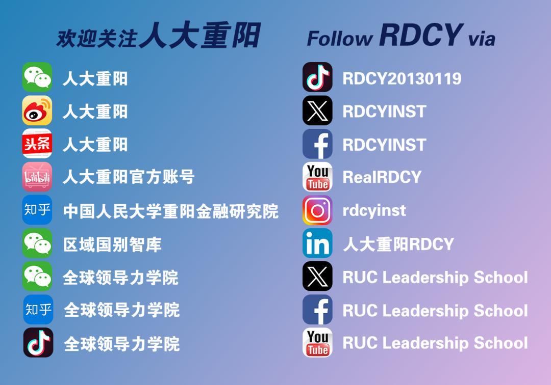 作爲中國特色新型智庫,人大重陽聘請了全球數十位前政要、銀行家、知名學者爲高級研究員,旨在關注現實、建言國家、服務人民。目前,人大重陽下設7個部門、運營管理4箇中心(生態金融研究中心、全球治理研究中心、中美人文交流研究中心、中俄人文交流研究中心)。近年來,人大重陽在金融發展、全球治理、大國關係、宏觀政策等研究領域在國內外均具有較高認可度。