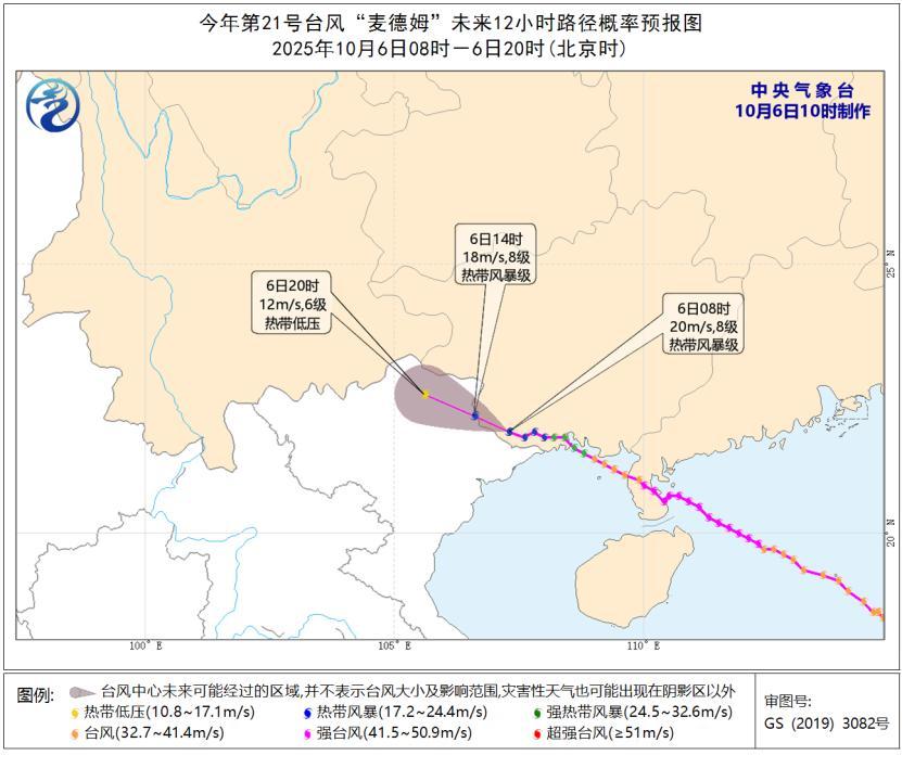 今年第21號颱風“麥德姆”(熱帶風暴級)的中心今天(6日)上午8點鐘位於廣西崇左市境內,最大風力有8級(20米/秒)。預計,“麥德姆”將以每小時15~20公里的速度向西偏北方向移動,強度逐漸減弱。