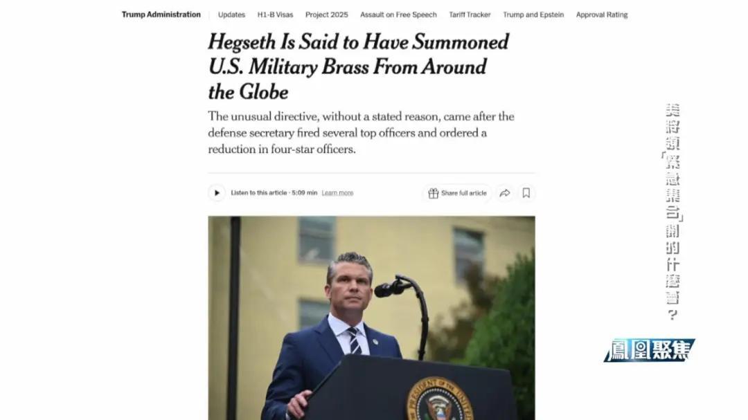 這場美“戰爭部長”赫格塞思緊急召集的、數百名分佈於全球各地的美軍將領參與的大會,重要程度不言而喻。9月28日,特朗普在接受採訪時,形容這個會議的主題爲“團體精神”,並明確表態自己將參加會議發表講話。《紐約時報》稱,對特朗普而言,這類“被軍方領導人圍繞”的場景向來是他所青睞的,此次機會或許難以抗拒。