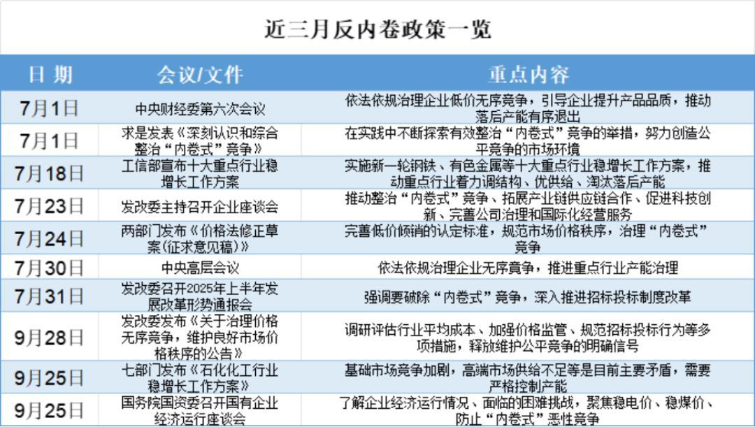 近期,我國在“反內卷”領域動作頻頻,而相關反內卷政策密集落地,推動相關產業鏈的價格築底與高質量轉型,同時也旨在治理價格無序和惡性競爭的亂象。