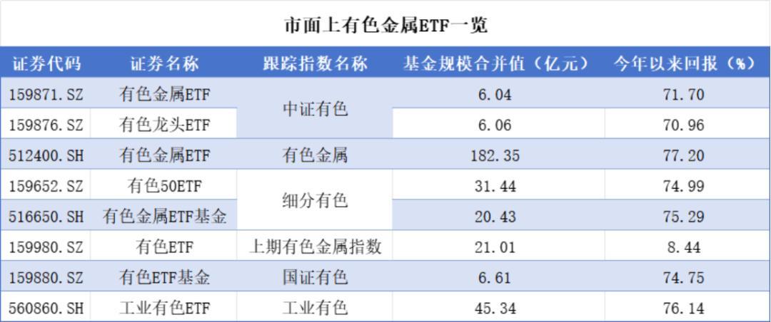 風雲君爲此整理了市面上規模大於1億的有色金屬ETF,今年以來回報均超過70%,以供投資者參考。