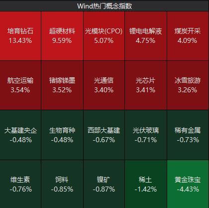 板塊方面,培育鑽石、超硬材料等概念在午後強勢拉昇,惠豐鑽石收盤“30cm”漲停,四方達午後“20cm”漲停,力量鑽石大漲18.71%,黃河新材、三超新材漲停等。