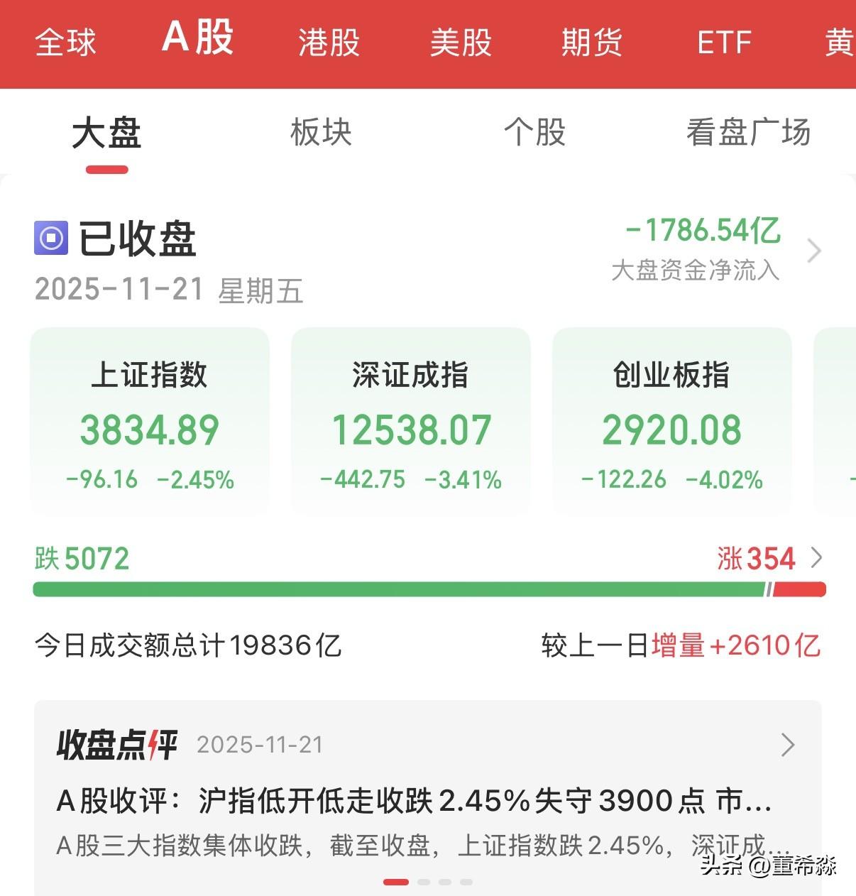 A股市場11月21日遭遇全面重挫,三大指數低開低走,收盤跌幅均超過2%。其中,創業板指成爲下跌重災區,全天暴跌4.02%,滬指與深成指分別下跌2.45%和3.41%。市場恐慌情緒蔓延,近5100只個股收盤下跌,僅有354只個股僥倖上漲。