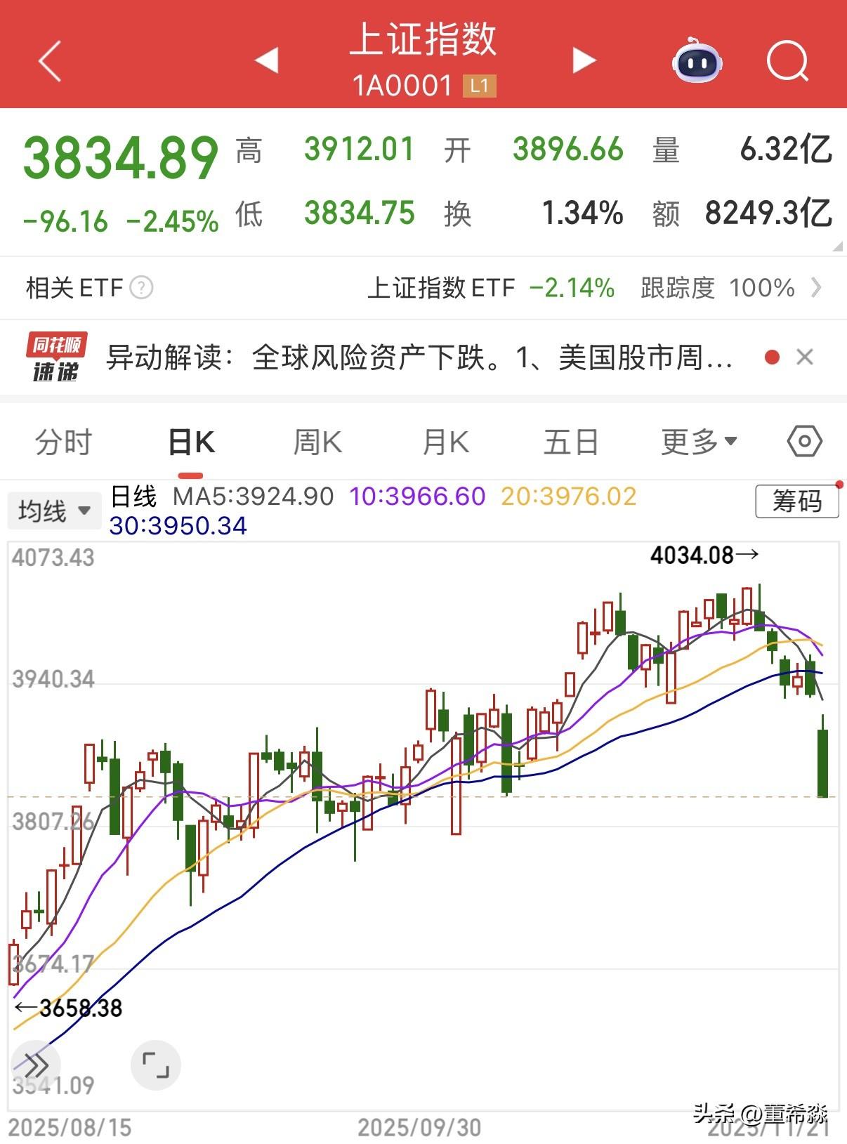 今日A股市場的暴跌堪稱一場“完美風暴”。從開盤起,三大指數便低開低走,毫無反彈之力。截至收盤,上證指數報收3834.89點,下跌2.45%,創下近期最大單日跌幅。