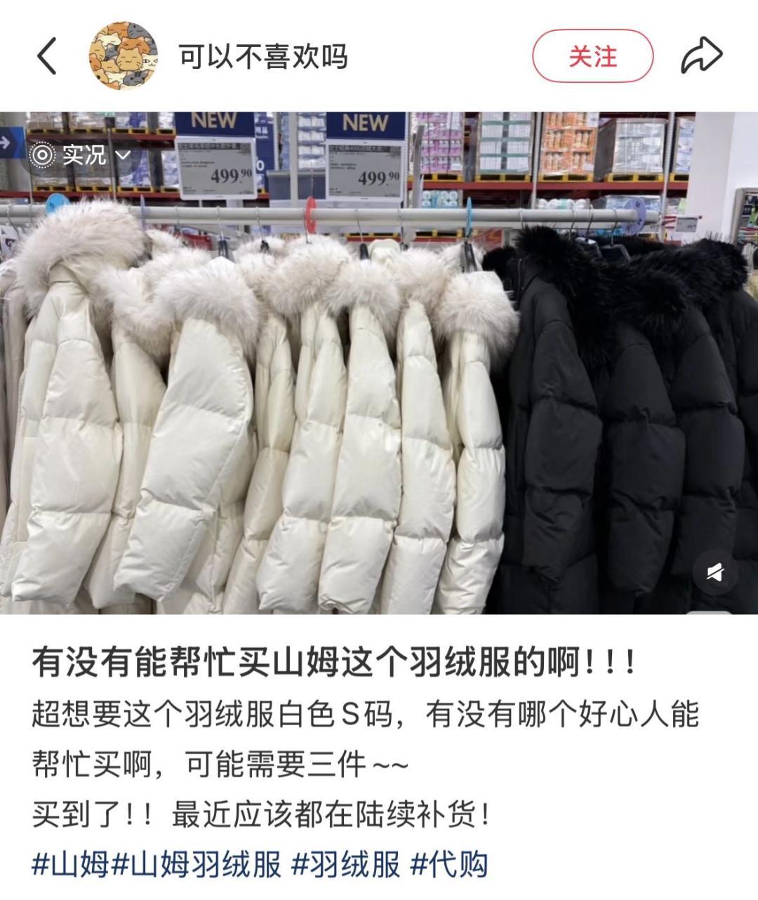專門做山姆代購的君君告訴有意思報告,所有款式的羽絨服中,最受歡迎的是499元鴨絨白色款S碼,即使是在天氣相對溫暖的廣東,也已經斷貨一個月了。“但恰恰這個最受歡迎的顏色和碼數,貨源最少,我工作日幾乎每隔一天就去看一次,也沒蹲到。”君君說。