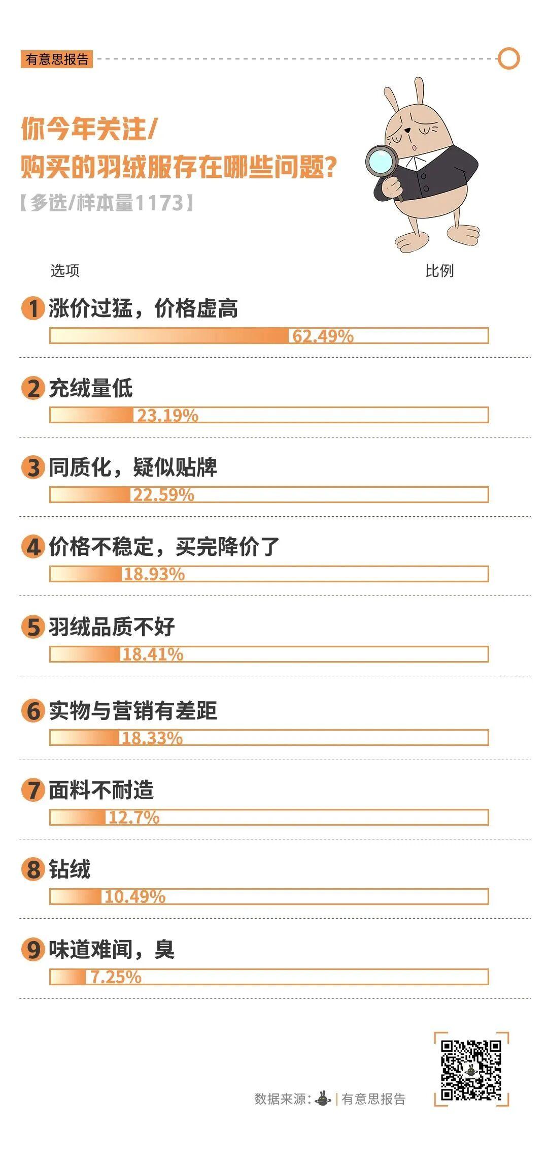 事實上,這並不是李莉一個人的煩惱,有意思報告調查顯示,“漲價過猛,價格虛高”是2025年大家購買羽絨服時關注到的主要問題,有超六成消費者選擇此項。同時,“充絨量低”和“同質化/疑似貼牌”等問題也高居榜單前列。