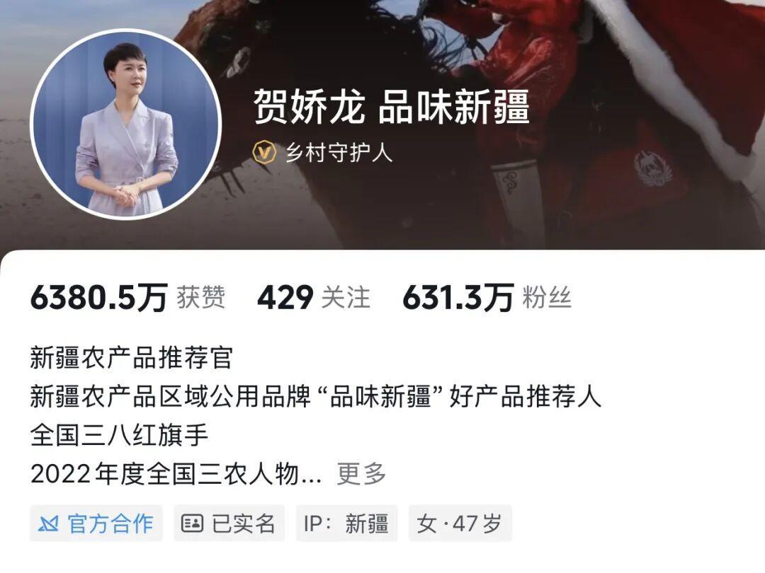 2023年4月,賀嬌龍出任新疆維吾爾自治區農產品品牌建設與產銷服務中心(新疆維吾爾自治區農業對外合作中心)主任。作爲“新疆農產品推薦官”,她帶領直播團隊展銷新疆特色農副產品。截至2026年1月4日,其抖音賬號“賀嬌龍 品味新疆”已擁有粉絲超630萬,發表作品810餘條,獲贊逾6380萬。其個人不收取任何報酬,所有直播打賞均用於公益事業。