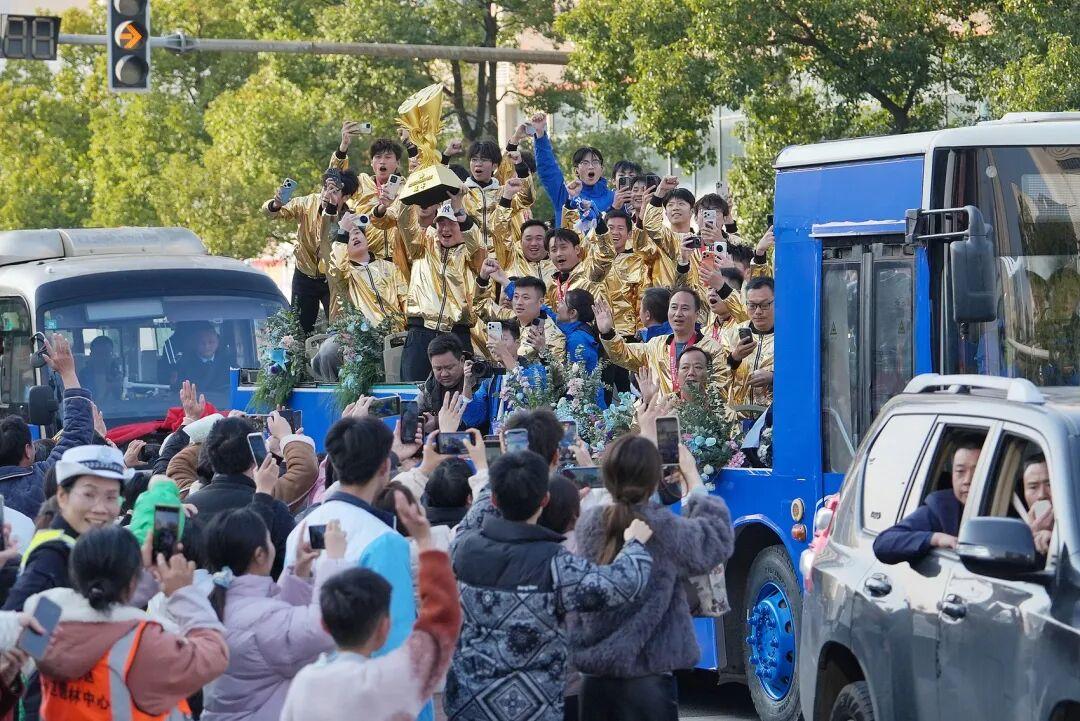 △“湘超”冠軍永州隊回到湖南永州,球員們乘公交花車亮相。(圖/楊華峯/中新社湖南分社/視覺中國)