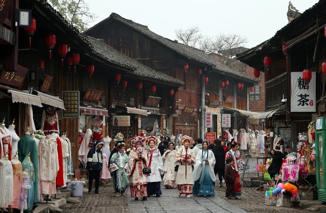 △湖南永州,遊客身着古裝在零陵柳子古街體驗穿越樂趣。(圖/視覺中國)