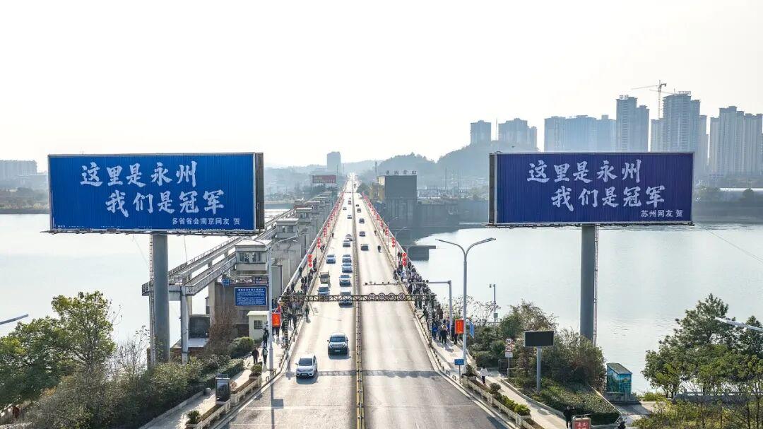 2026年1月3日,冷水灘區宋家洲大橋橋頭,一塊藍色廣告牌悄然立起,上面寫着“這裏是永州,我們是冠軍!蘇州網友賀”。南京網友馬上被激起了勝負欲,馬上在旁邊立起同樣的牌子,落款“多省省會南京網友賀”。