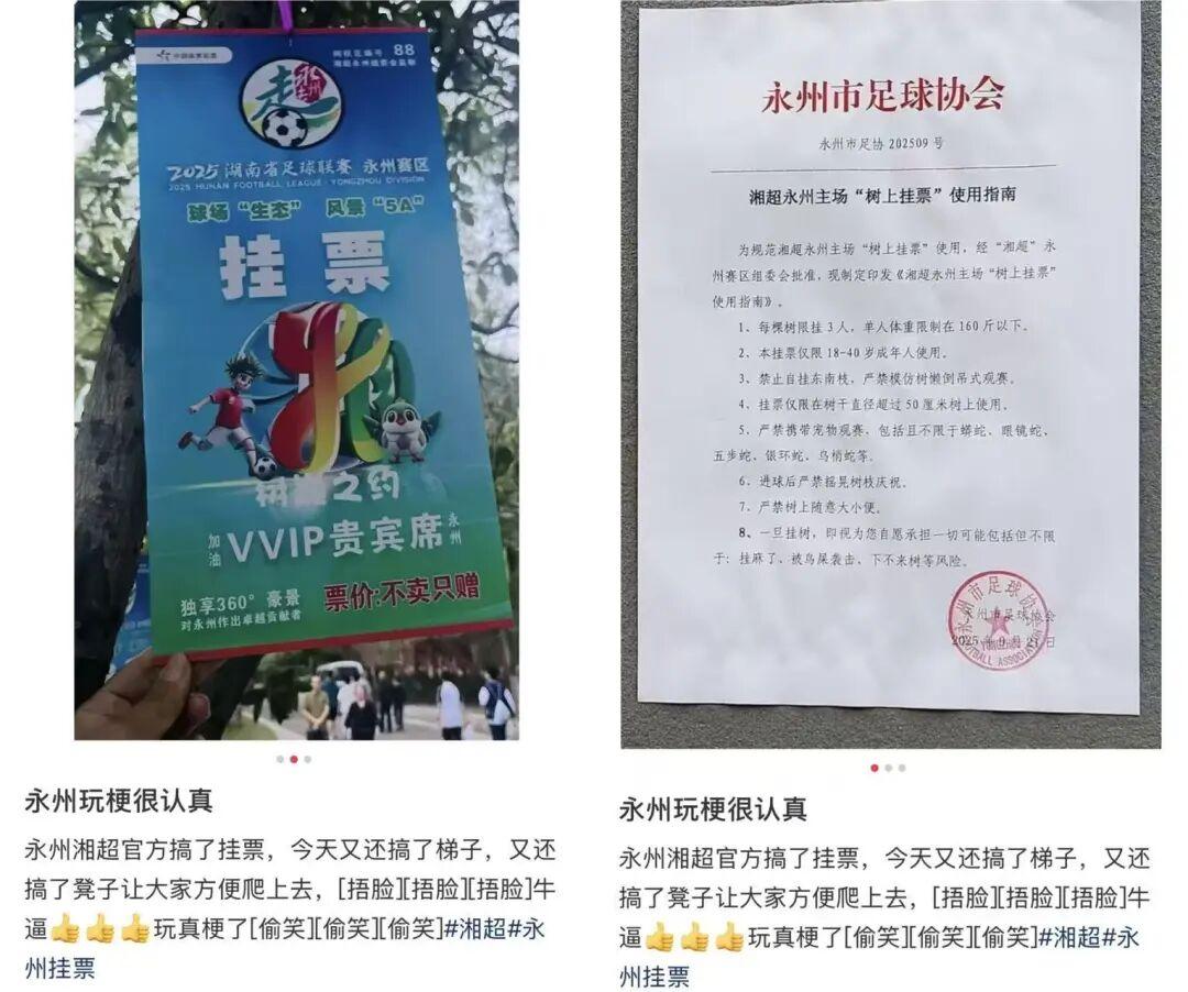 永州隊首個主場比賽時,門票很快被搶光,有網友調侃要買“掛票”,爬上體育場四周的大樹觀賽。沒想到,永州市足協竟然真的發佈了《“樹上掛票”使用指南》,明確規定每棵樹限3人,禁止倒吊觀賽,嚴禁攜帶蟒蛇、眼鏡蛇、五步蛇觀賽。官方下場玩梗,將城市的運動熱情推向高潮。