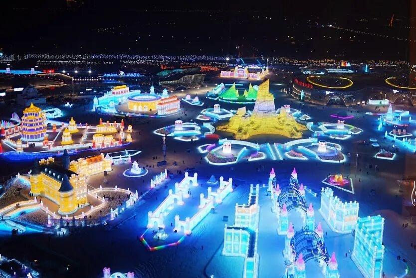 在夜幕中,它又流光溢彩,藍的像深海,紫的如幻夢,黃的似暖陽。這些嵌入冰體裏的燈光,讓整座冰雪之城始終熠熠生輝。漫步其中,彷彿置身一座魔法世界般的琉璃宮殿。