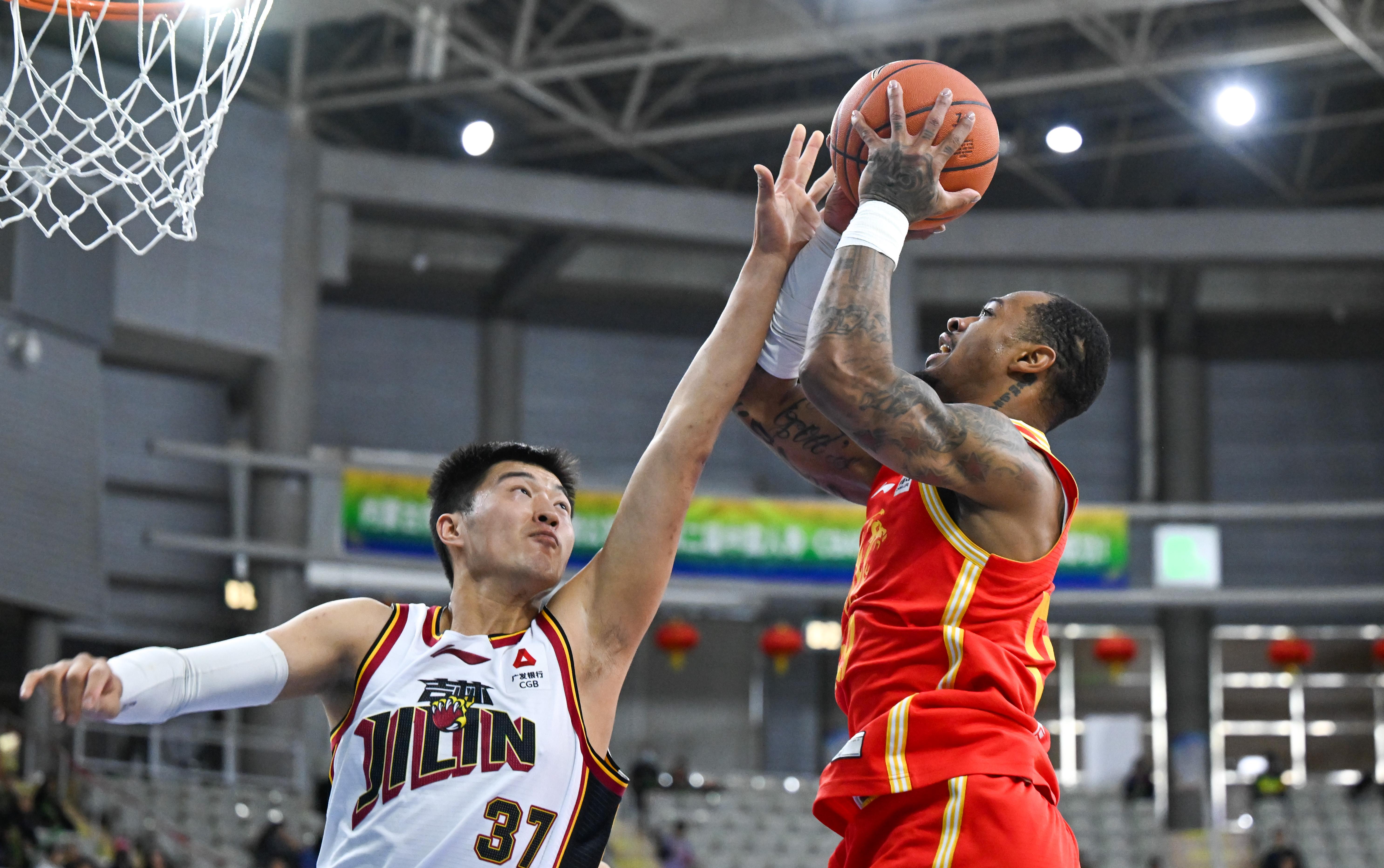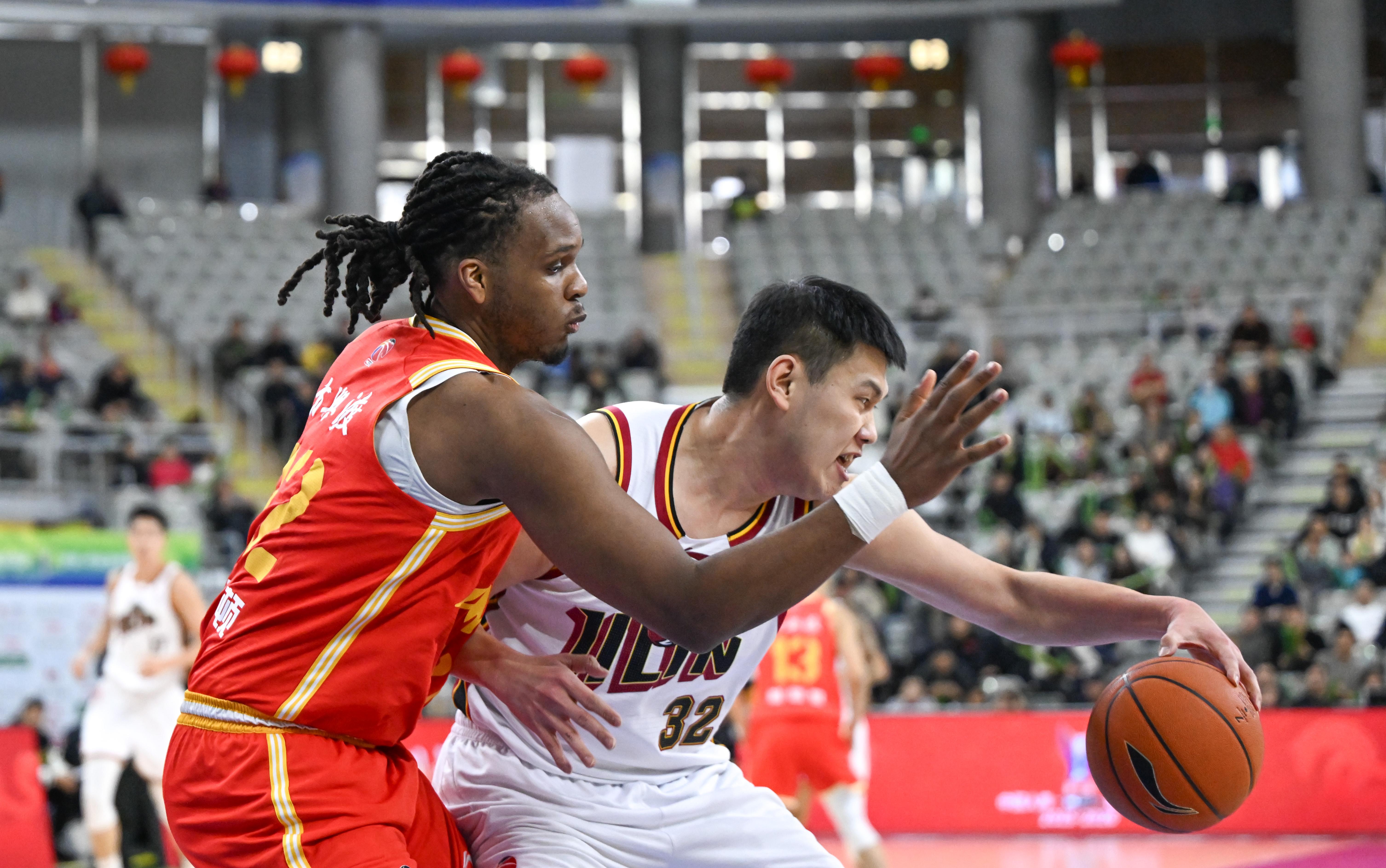 2月7日,浙江方興渡隊球員卡爾頓(左)在比賽中防守吉林長白山恩都裏隊球員王化東。 新華社記者 貝赫 攝