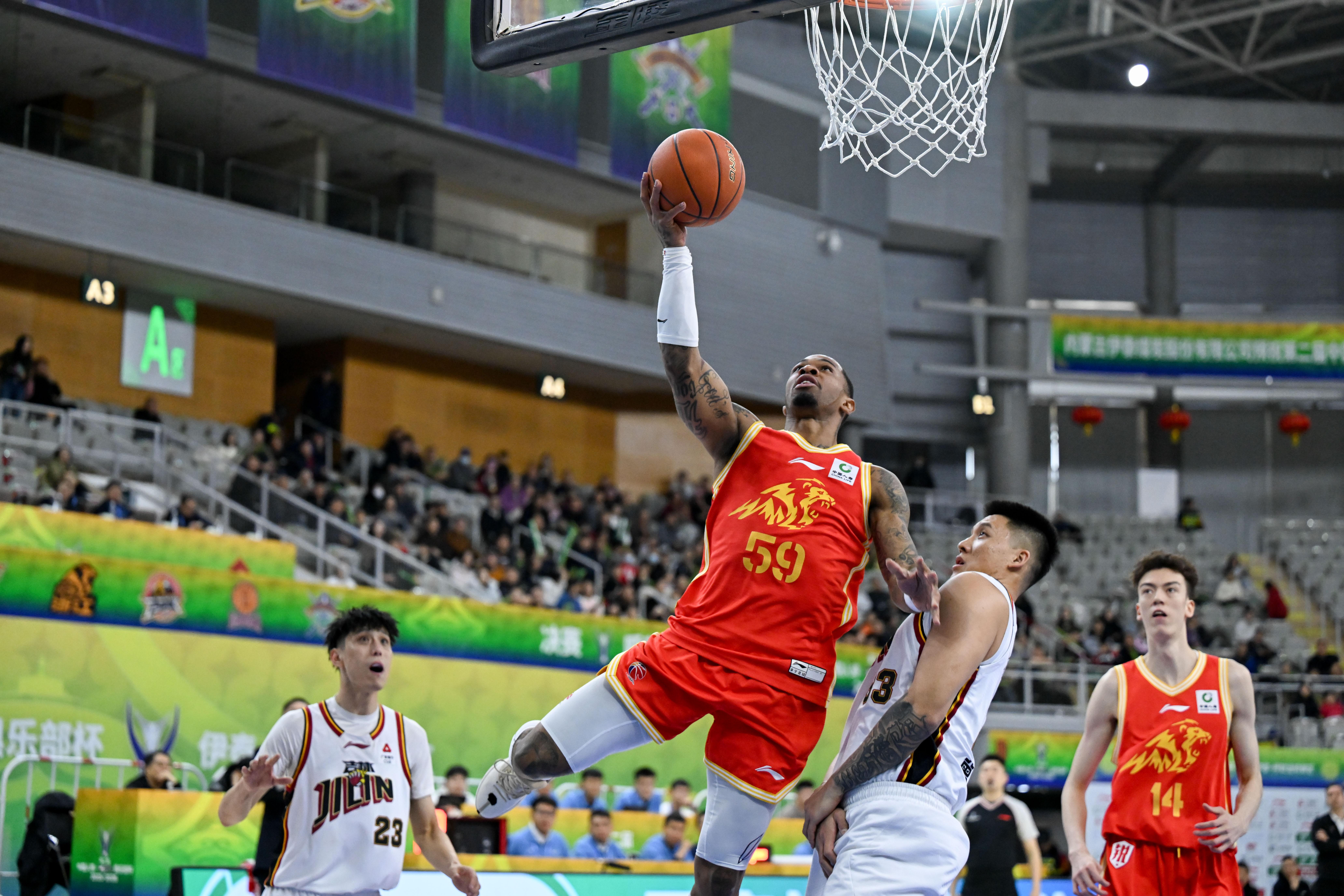 2月7日,吉林長白山恩都裏隊球員欒利程(前中)在比賽中上籃。 新華社記者 貝赫 攝