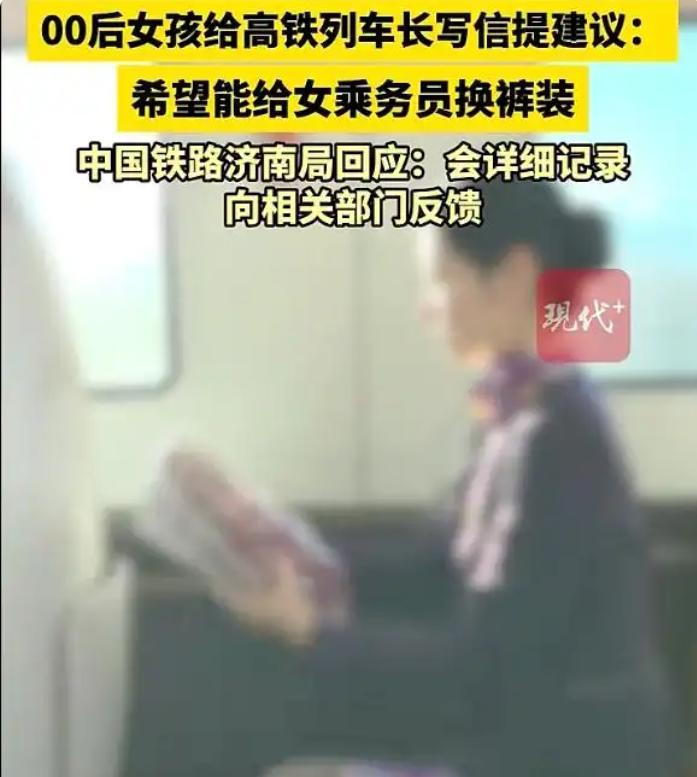 據現代快報報道,近日,00後女孩龐博乘坐高鐵時,發現女乘務員統一穿着裙裝和肉色打底褲,長時間工作時走路不便、舒適度差,便手寫書信建議將裙裝制服更換爲更實用的褲裝。