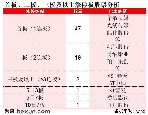 從漲停連板數量來看,今日首板漲停個股多達47只,佔比達66%,說明今日市場首板情緒活躍,資金在挖掘新熱點或超跌反彈機會,代表股票包括華數傳媒、光線傳媒、醋化股份、兆馳股份等,涉及傳媒、化工、電子等板塊。