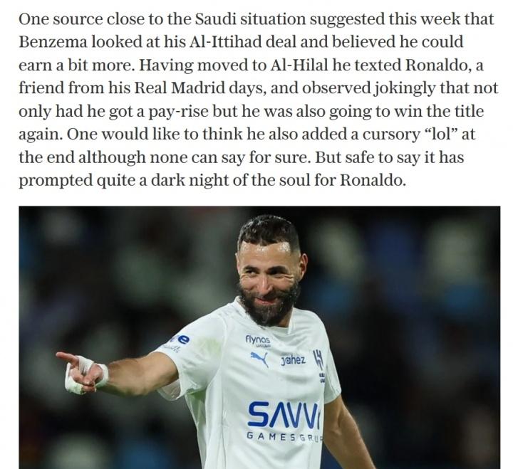 02月10日訊 據英媒《每日電訊報》報道,本澤馬在轉會加盟利雅得新月後,曾發短信跟老隊友C羅開玩笑。