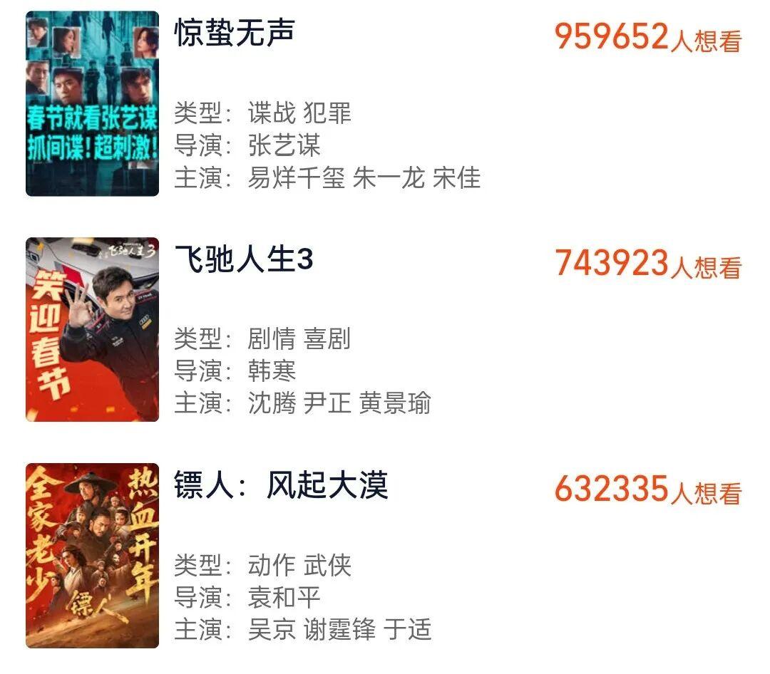 據燈塔專業版數據,《驚蟄無聲》《飛馳人生3》《鏢人:風起大漠》淘票票累計想看數暫列前三,強勢形成第一梯隊,想看數均已超過63萬。