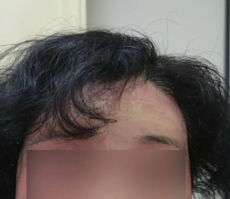 到了第二天,情況愈發嚴重——陳阿姨的頭皮乃至額頭、臉頰的皮膚都開始潰爛、流水,驚恐無比的她急忙來到杭州市中醫院皮膚科急診。經檢查,陳阿姨屬於美髮引起的重度接觸性皮炎,頭皮大面積紅斑、滲液,面部眼瞼紅腫得無法睜眼。爲了方便清創上藥,陳阿姨不得不剃光了頭髮,接受治療。