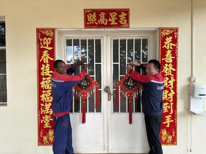 中方和剛果(金)員工圍聚一起,貼春聯、掛燈籠、裝彩燈,一張張笑臉映着喜慶的紅燈籠,空氣中處處瀰漫着濃濃的年味。剛果(金)當地員工恩戈伊掏出手機,對準紅燈籠和身邊的夥伴,將這份跨越國界的喜慶與溫情,定格在鏡頭裏。
