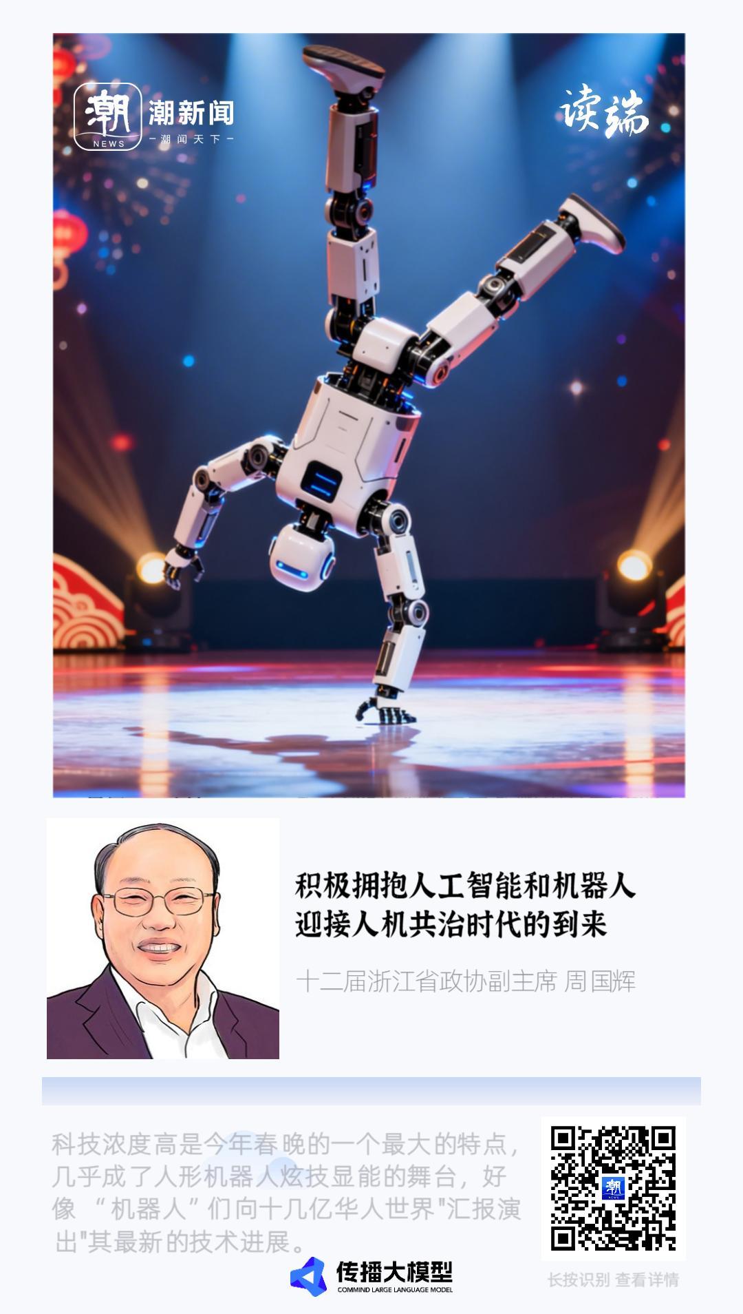 科技濃度高是今年春晚的一個最大的特點,幾乎成了人形機器人炫技顯能的舞臺,好像“機器人”們向十幾億華人世界“彙報演出”其最新的技術進展,不只是簡單的舞蹈,而是深度融入各類節目。最炫目的是宇樹機器人與武校學員同臺,表演的後空翻、耍棍、醉拳等高難度動作,讓人有一種“士別三日 刮目相待”之感,還有機器人在歌舞、小品中的走場串戲,相當程度上展示了中國機器人產業的多元化實力。現在提倡發展前沿技術的應用場景,有十多億人在線圍觀的春晚無疑是人形機器人最大的展示場景,沒有之一。這不僅豐富和增強了春晚的時代感、時尚感和現實感,而且在機器人和人工智能等前沿技術的傳播和普及上發揮着積極而獨特的作用。在我看來,今年春晚就是新質生產力寓教於樂、影響巨大的生動場景和舞臺。這也是中國推進科技創新和科學普及的現實優勢。