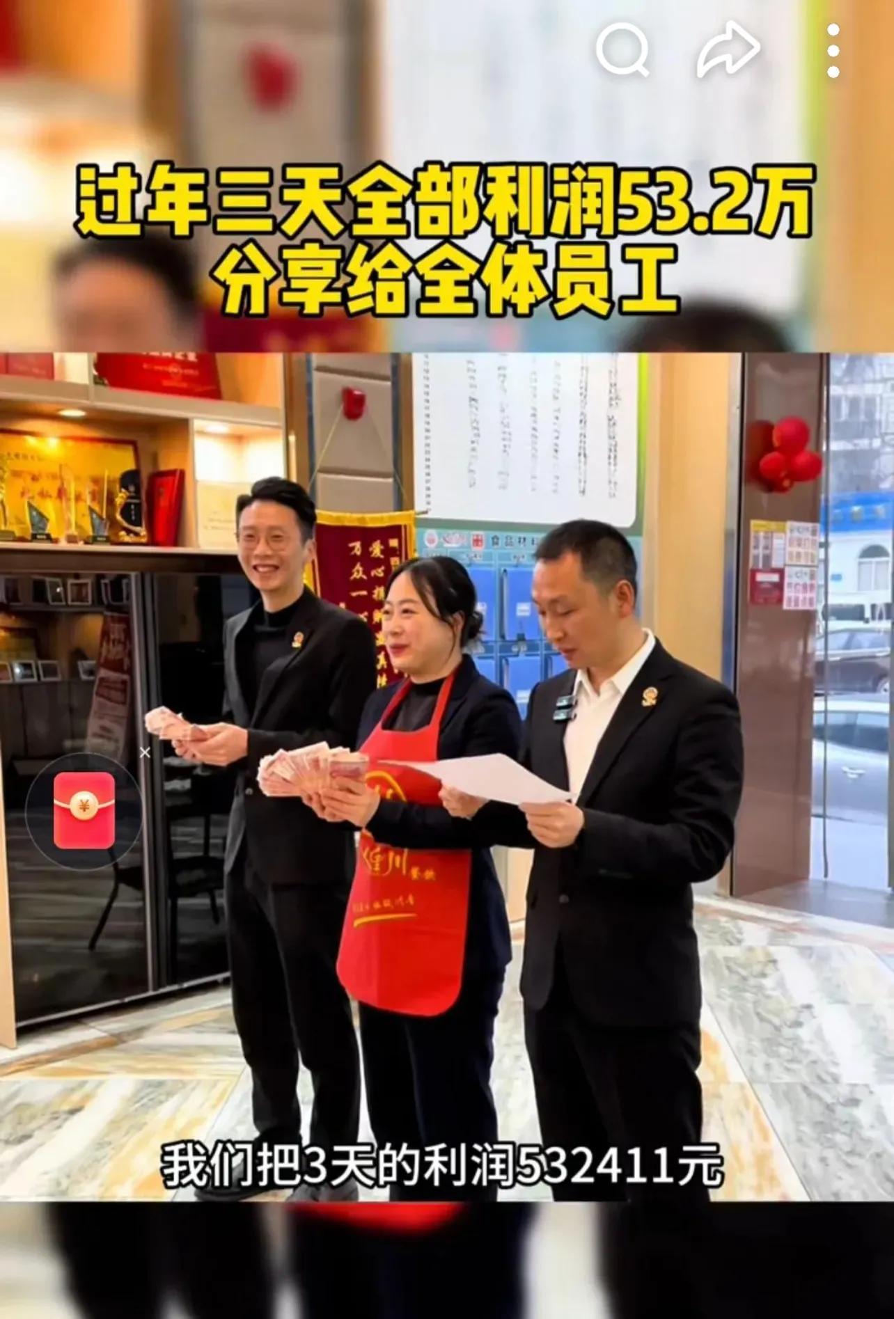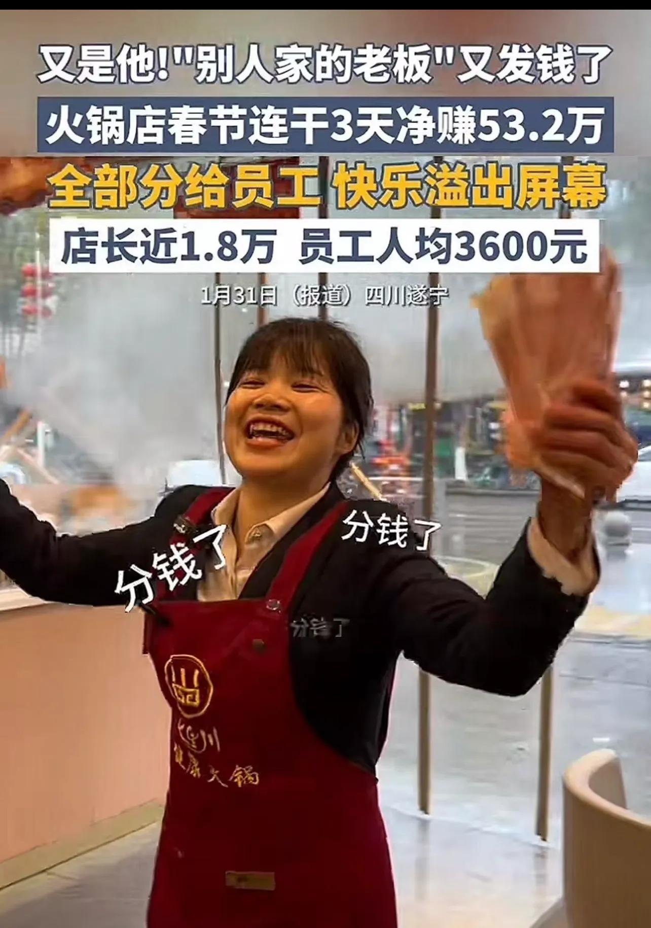 2月20日,農曆正月初四,四川遂寧七里川火鍋店的員工們,再次領到了一筆沉甸甸的分紅:春節前四天的利潤33.9萬元,老闆全部發給大家。店長拿到14860元,服務員最高4865元,就連保潔崗位也分到了1447元。這已是老闆黃厚明連續第四年爲員工發放春節分紅,發放天數也從最初的三天增加至四天。