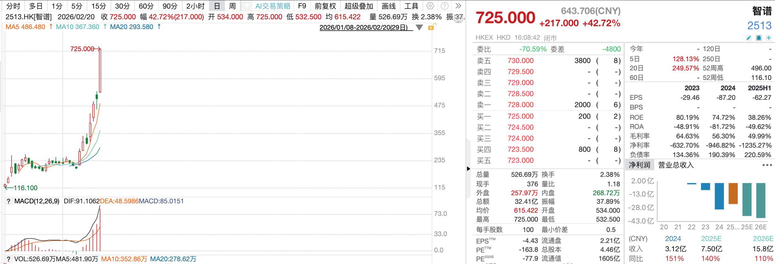 2026年2月20日,港股馬年紅盤首日,市場呈現出極端的結構化走勢。儘管恆生科技指數受傳統互聯網權重股拖累下跌2.91%,但以智譜(Zhipu AI)與MiniMax爲代表的“AI新秀”板塊逆勢狂飆。智譜(02513.HK)收盤暴漲 42.72%,市值一舉衝破 3200億港元,較1月初IPO時累計漲幅超500%。MiniMax(00100.HK): 收盤上漲 14.52%,市值同樣站穩 3000億港元 大關。