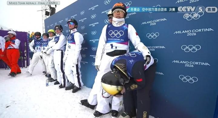 02月21日訊 自由式滑雪空中技巧混合團體決賽,王心迪、李天馬出現失誤,中國隊收穫銅牌。李天馬落地後自責落淚。徐夢桃則在一旁安慰他。