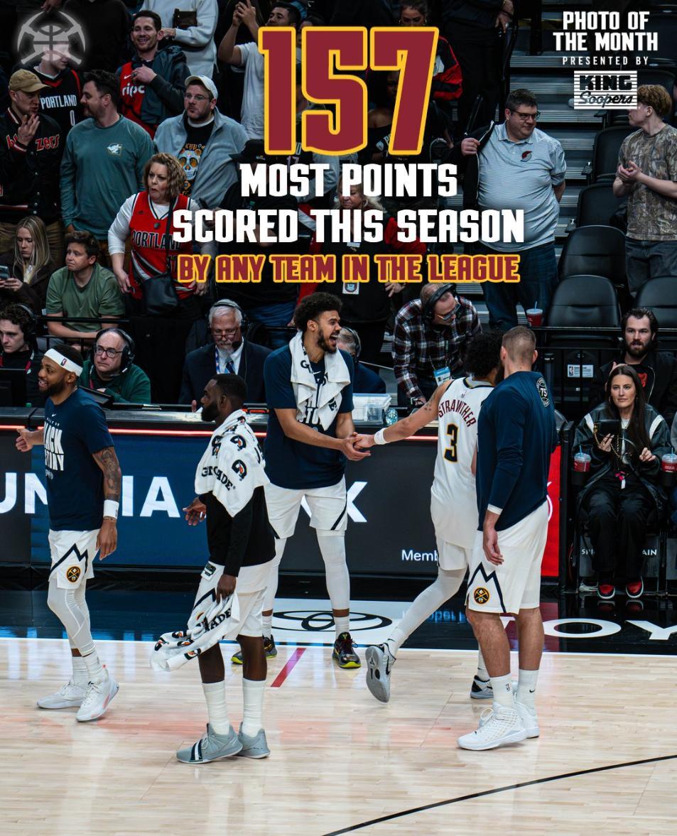 掘金157-103狂勝開拓者,這場比賽掘金贏球后與湖人的勝場差還有0.5場,此役掘金單場157分創造隊史單場新高,淨勝分54分也是隊史單場新高,背靠背淨勝54分是NBA歷史新高。這場比賽約基奇32+9+7+4斷三節打卡。