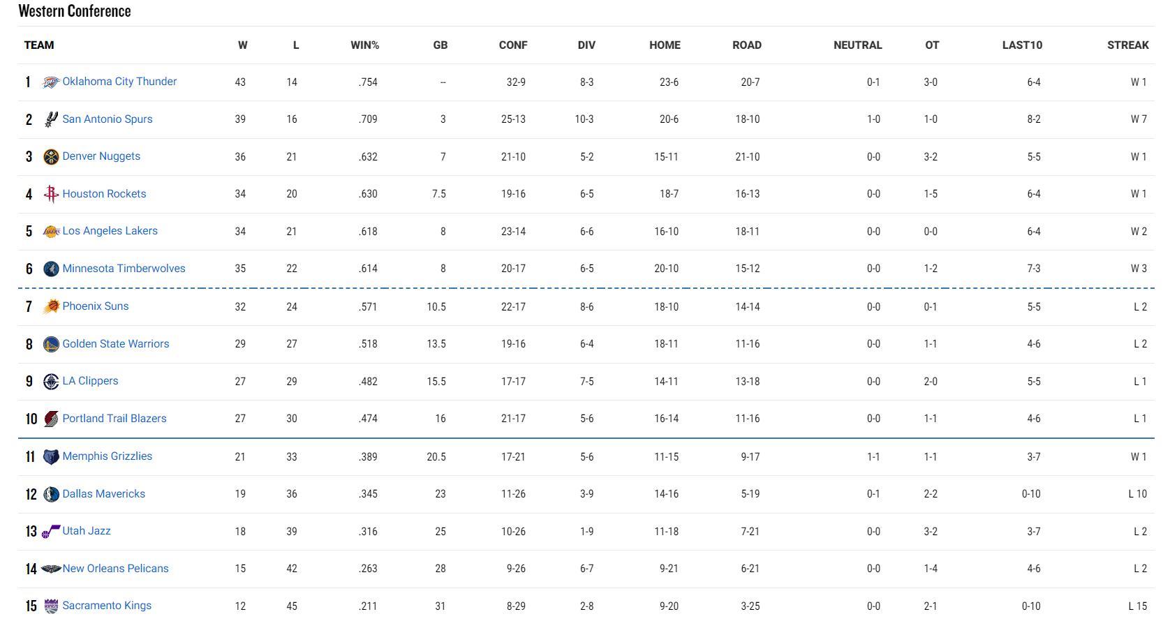 西部排名:雷霆、馬刺、掘金、火箭、湖人、森林狼、太陽、勇士、快船、開拓者、灰熊、獨行俠、爵士、鵜鶘、國王。