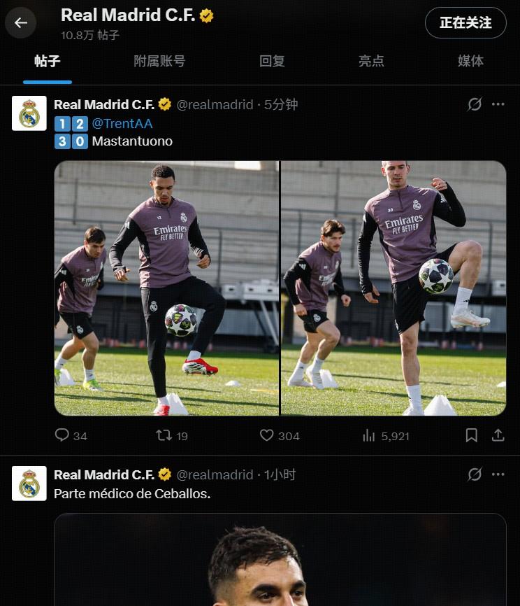 皇馬官推在這條道歉消息發佈後更新了阿諾德和馬斯坦託諾的訓練照,此前公佈了塞瓦略斯的傷情公告。