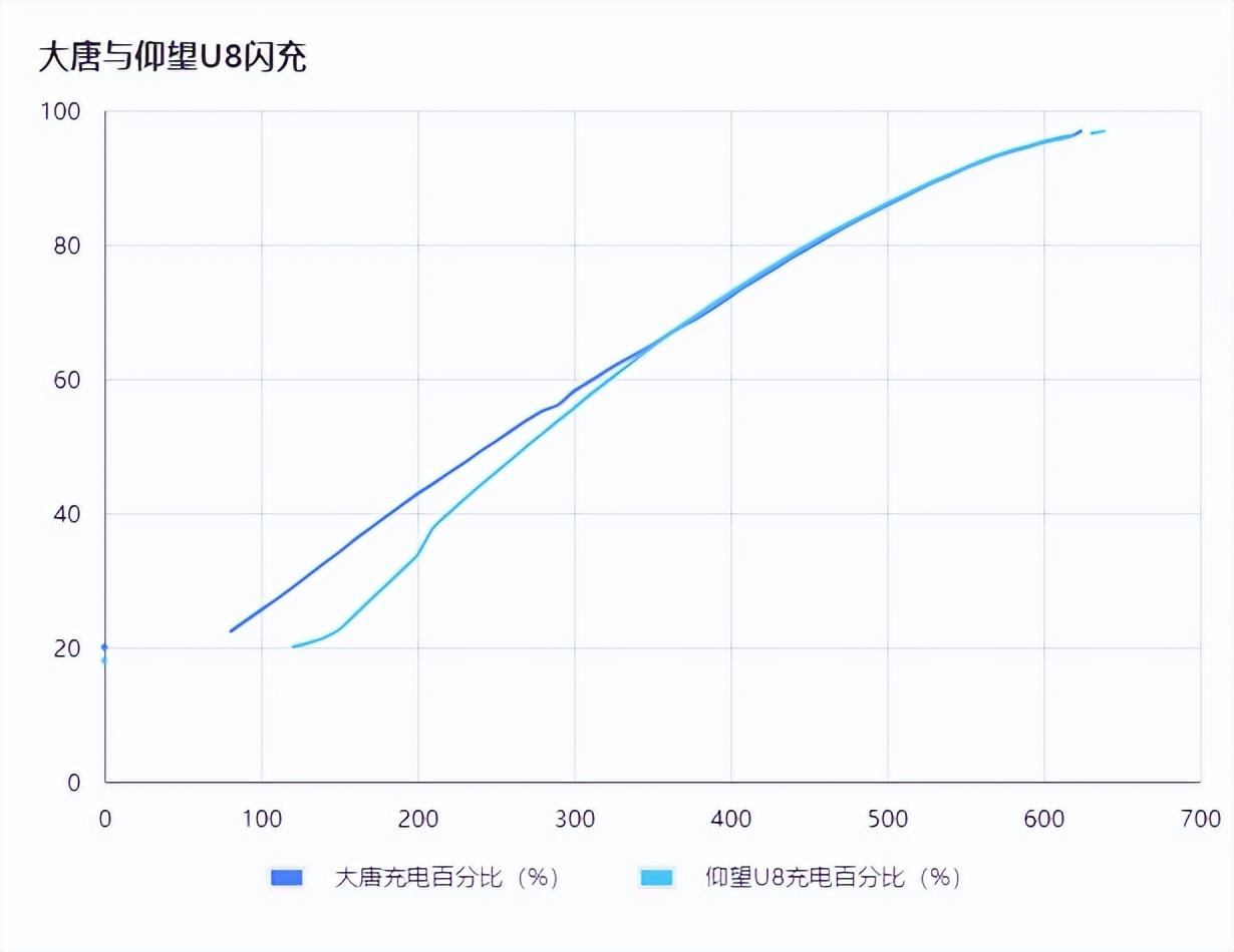 由於比亞迪閃充車機上是沒有顯示充電功率的,所以我還一幀一幀的統計了大唐和仰望 U8 的充電百分比和續航,可以看到,比亞迪閃充的功率輸出非常的平穩。