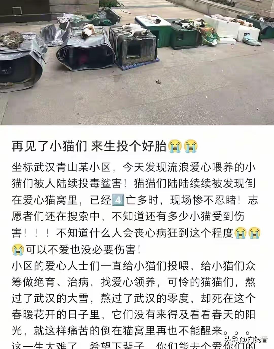 業主覺得不是巧合,直接報了警。派出所民警趕緊過來拍照、取證,還聯繫了相關部門取走了幾具貓的屍體,剩下沒有及時帶走的由志願者幫忙處理,防止腐敗影響環境。有居民透露,事發當晚羣裏就炸了,很多人懷疑是跟最近幾天的小區消殺有關。因爲不久前,社區剛發過消殺通知,說三月初幾天要殺蟲滅鼠,涉及地下車庫、綠化帶和樓道。業主的第一個懷疑對象自然是物業。社交網站的討論一下冒出來,“物業毒貓”“清場”之類的詞立刻傳開了。